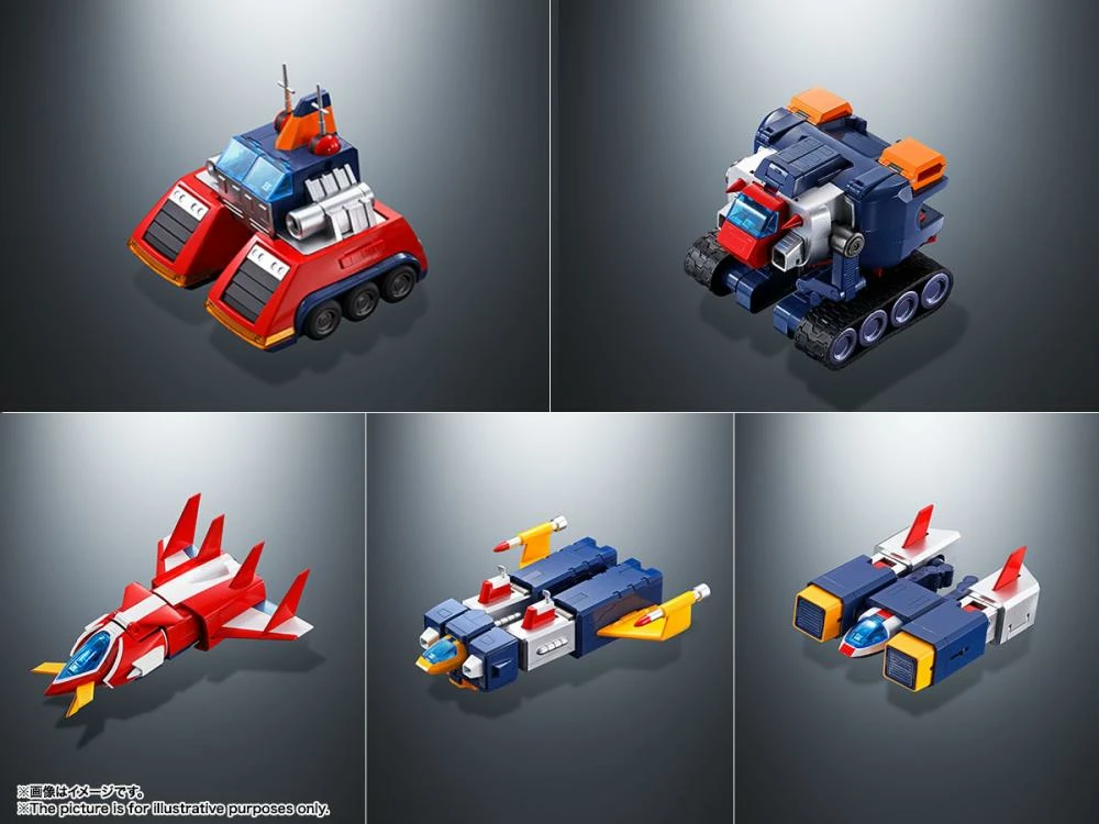 The legendary five-part combining super robot Voltes V is back with digitized combination sounds, special attack sounds, lines from the anime, and five songs! The five machines combine into the towering 36cm tall Voltes V — complete with sound effects for the docking sequence and weapon sounds! The support ship Taka-mecha and an all new enemy Boazan flying saucer are included, too