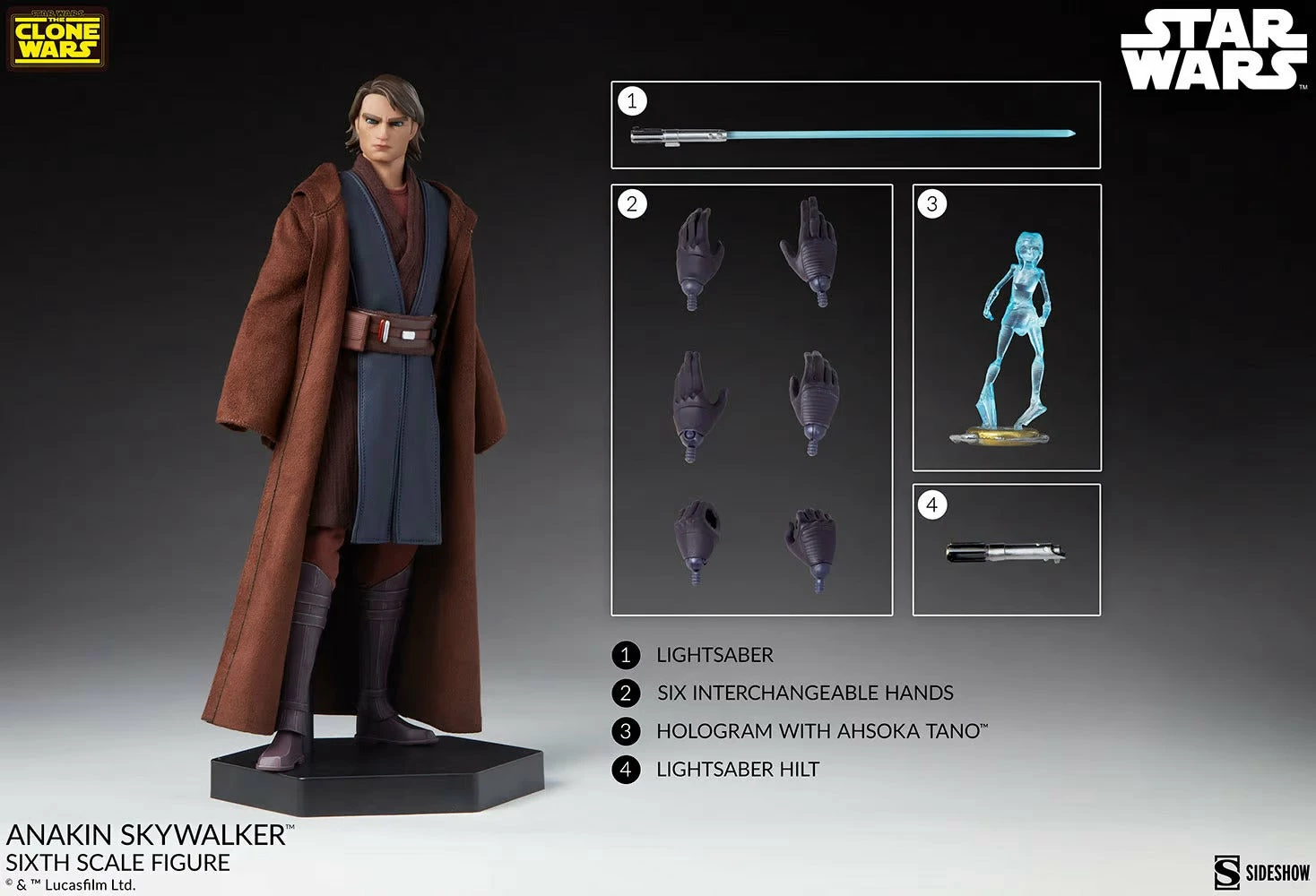 The Anakin Skywalker Sixth Scale Figure includes a number of stylized hands and swap-out accessories to give collectors a wide range of display options for the Jedi general. Anakin Skywalker comes with four pairs of stylized hands including a pair of grip hands, a pair of neutral hands, a pair of force hands, and a pair of fists for a wide variety of gestures and pose combinations. In addition, he comes with both a lightsaber hilt and lightsaber with its blue tapered blade unleashed for battle action. Finally, Anakin includes a holoprojector accessory with a sculpted Ahsoka Tano™ hologram for communicating with his Padawan.