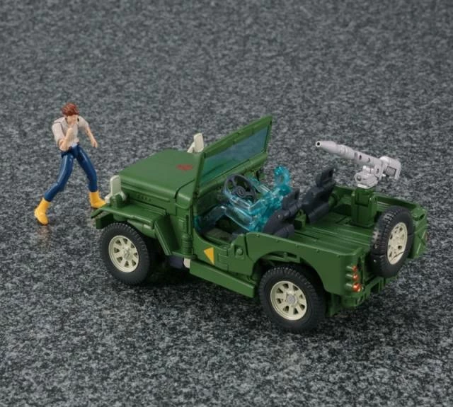 Inspired by the Transformers G1 cartoon, MP-47 Hound comes 2 interchangeable facial expressions, a convertible top for vehicle mode that can also attach to robot mode as a shield or backpack, gas can, key, attachable spare tire, laser scope, hologram blaster with attachable hologram effect, side mirrors, in-scale articulated Spike figure, and a Spike hologram figure. The fully-jointed figure features complex conversion from robot to military vehicle mode.